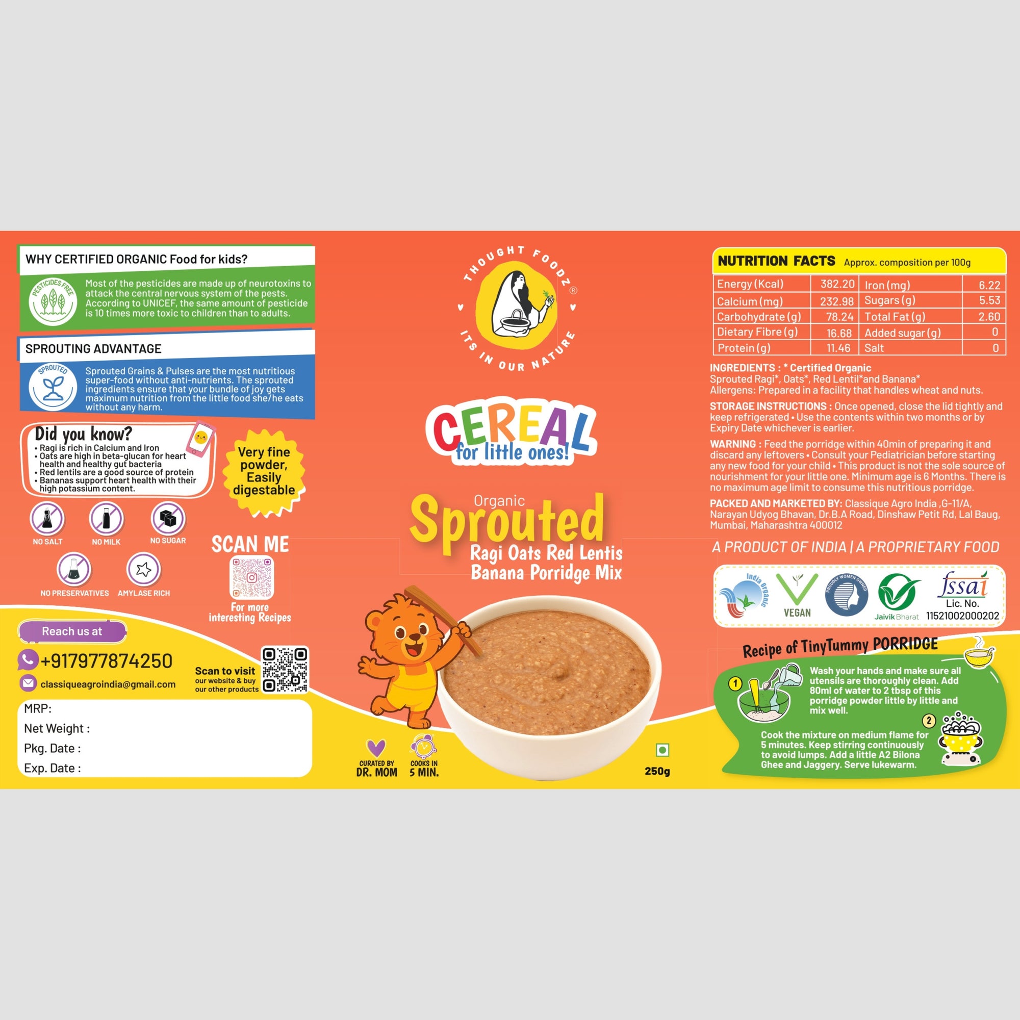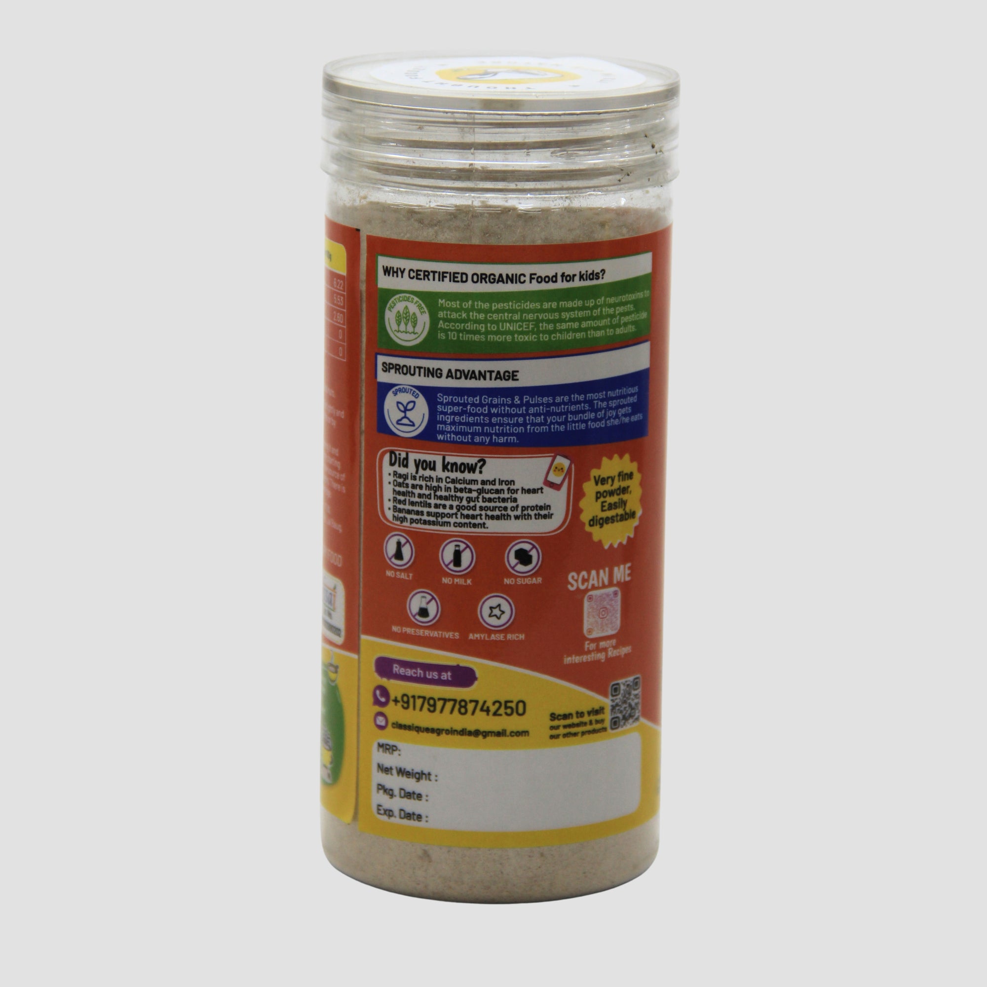 A: It contains oats, red lentils (pulses), and banana. Check for cross-contamination if there are nut allergies.