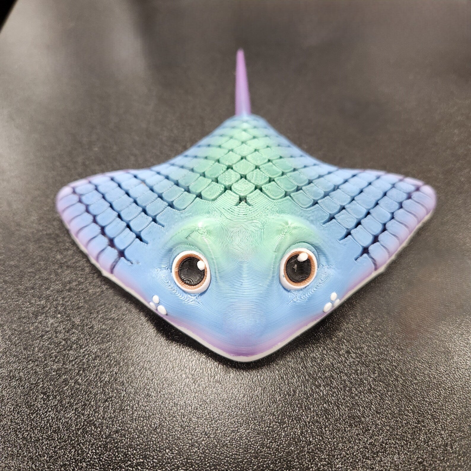 Wide wingspan, slender tail, and plump body mimicking a friendly manta ray.