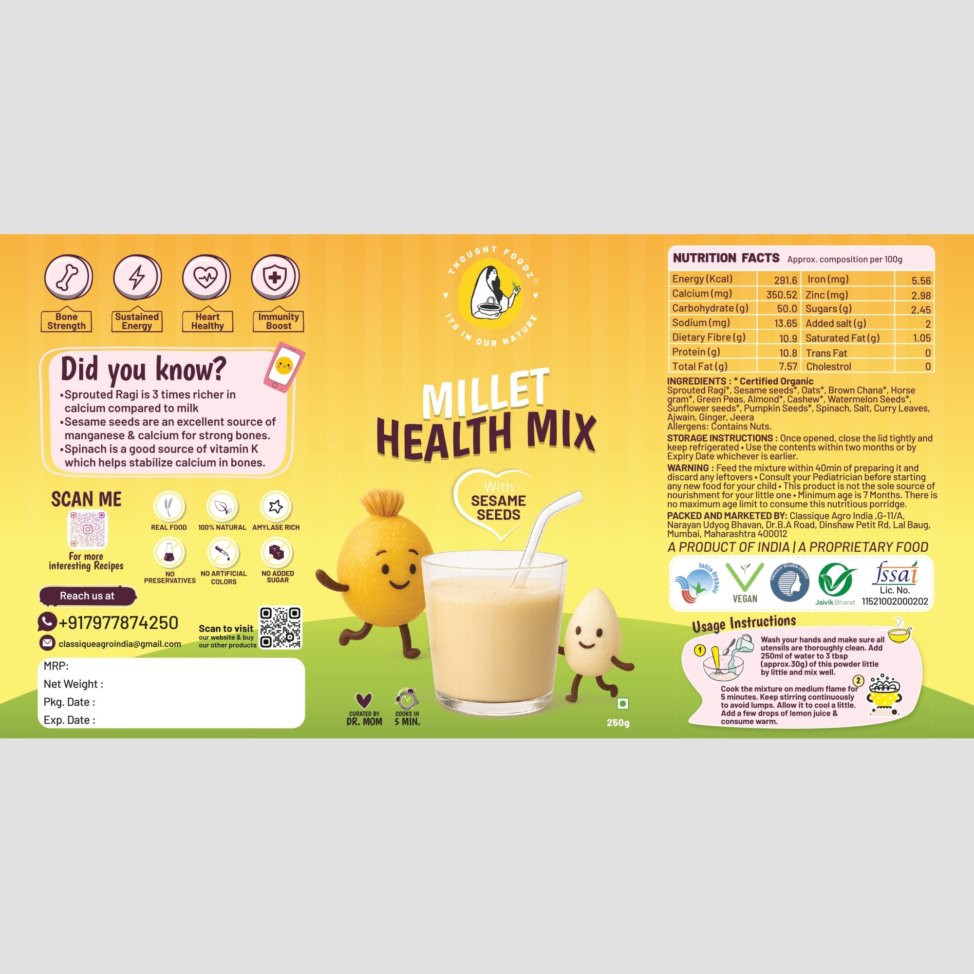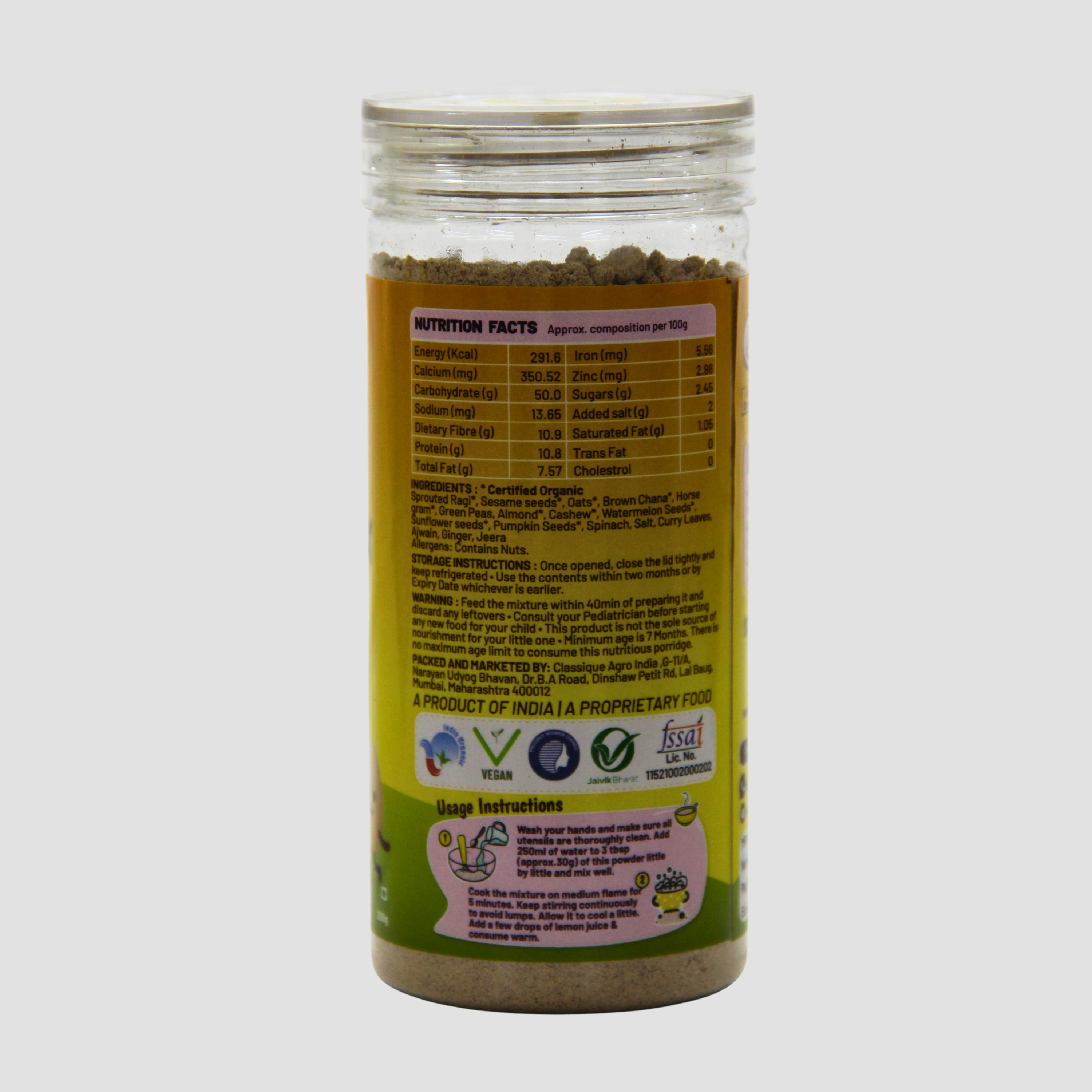 A: A nutrient-dense blend of sprouted millets, pulses, nuts, sesame seeds, and Ayurvedic herbs designed to support digestion, immunity, bone health, and overall nutrition.