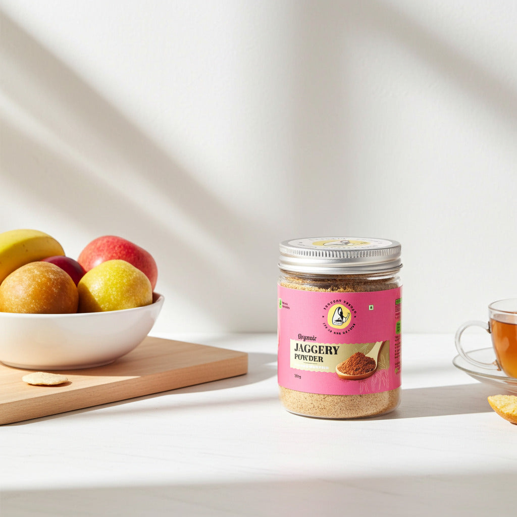 Organic Jaggery Powder is an unrefined, natural sweetener made from 100% organic sugarcane, rich in essential minerals like iron, magnesium, and calcium.