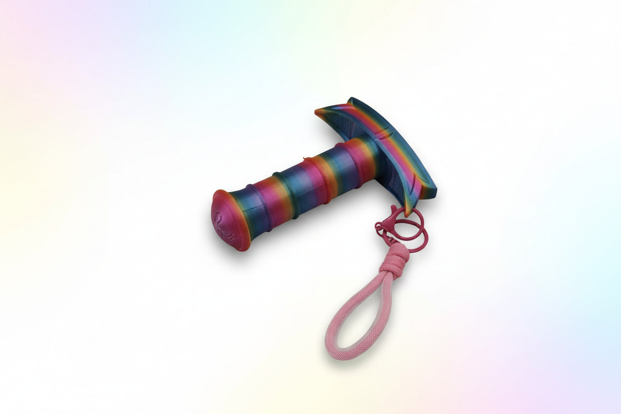 Hammer: Compact rainbow-striped head and handle with dual red tassel rings, ergonomic grip for battle pretend play.